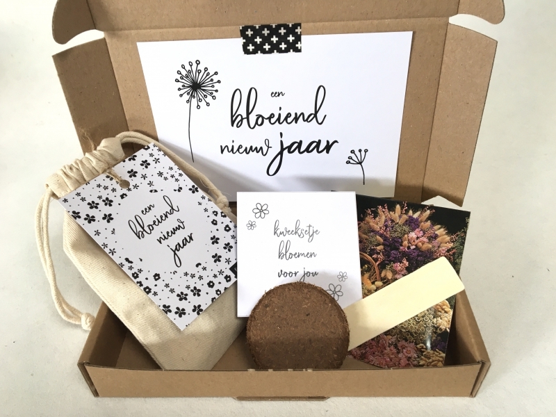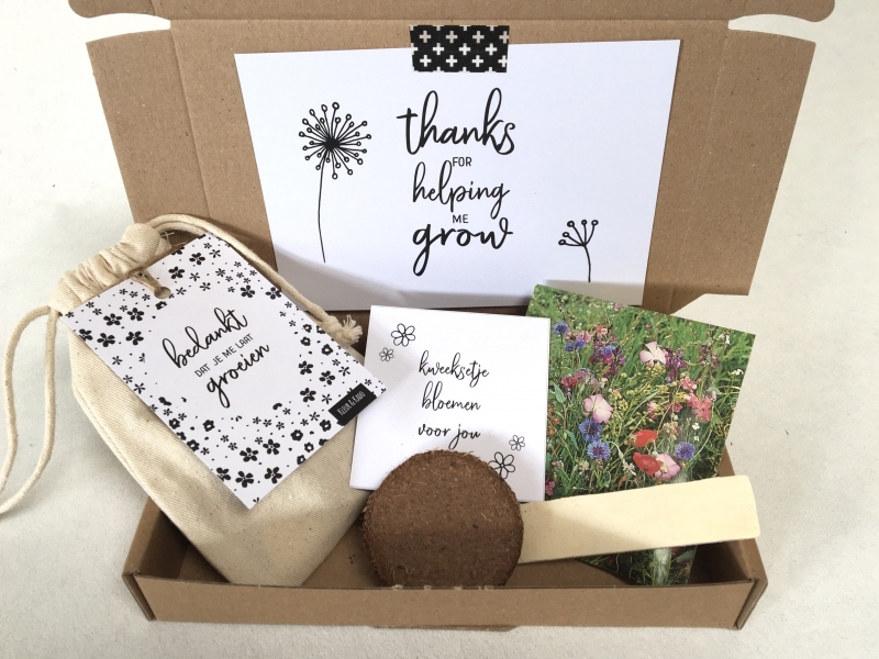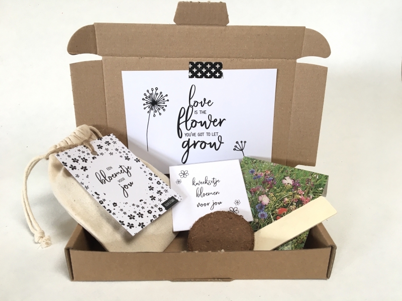 Gevuld met een katoenen zakje met kaartje, zakje bloemenzaad (deze kan variëren en is afhankelijk van het seizoen), turftablet, steeklabel, kaartje met gebruiksaanwijzig en wenskaart. Op de achterzijde van de kaart is ruimte voor een persoonlijke boodschap. Geef deze aan in het tekstveld dan schrijven wij deze, desgewenst, voor je op de kaart.