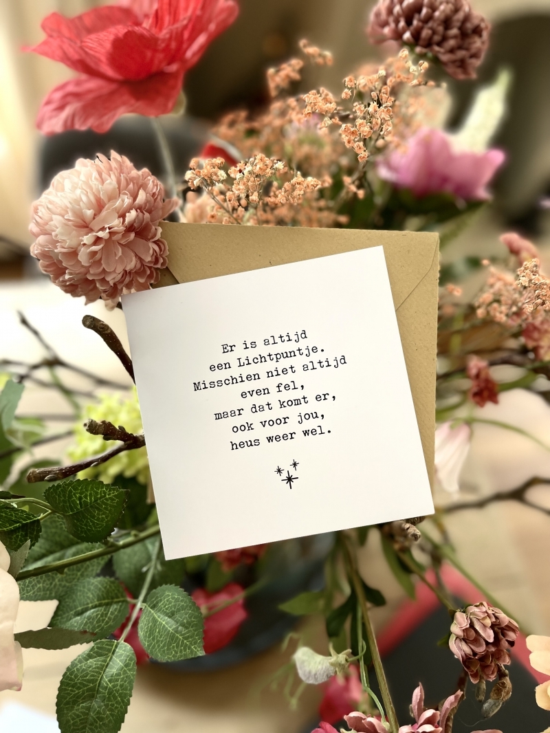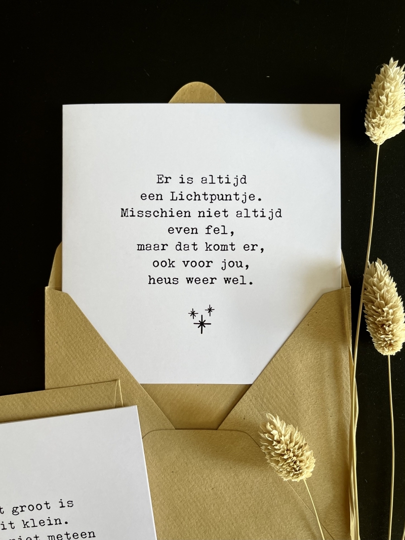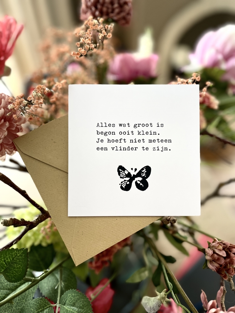 Het is een dubbele kaart vierkant 13x13cm met kraft envelop en per stuk verpakt in folie.