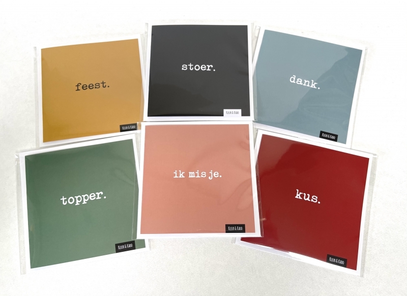Gekleurde kaartencollectie in mooie kleurtjes met eenvoudige, pakkende teksten.