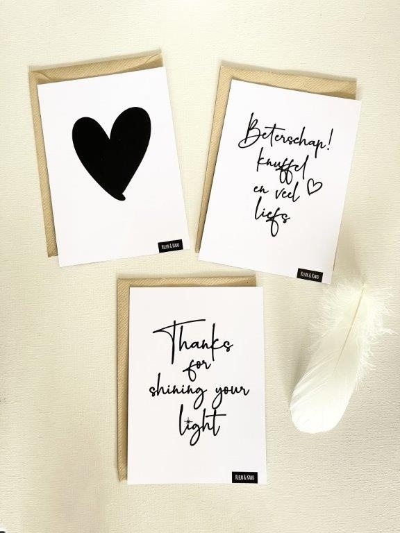 Altijd handig om wat leuke kaarten in huis te hebben en nog mooier om te versturen met een persoonlijke boodschap. Enkele kaarten met kraft envelop, per stuk verpakt in folie.