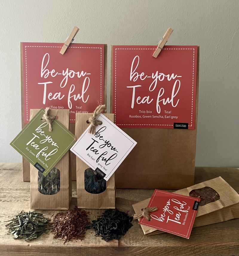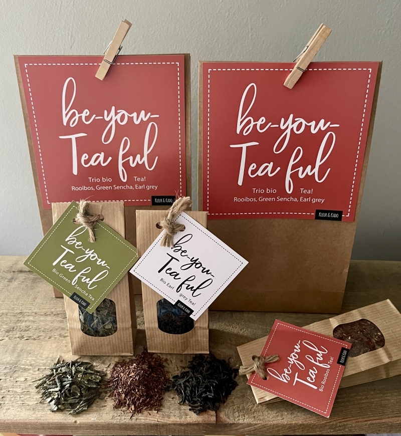 Gevuld met (h)eerlijke verse biologische losse thee: Rooibos, Green sencha en Earl grey.