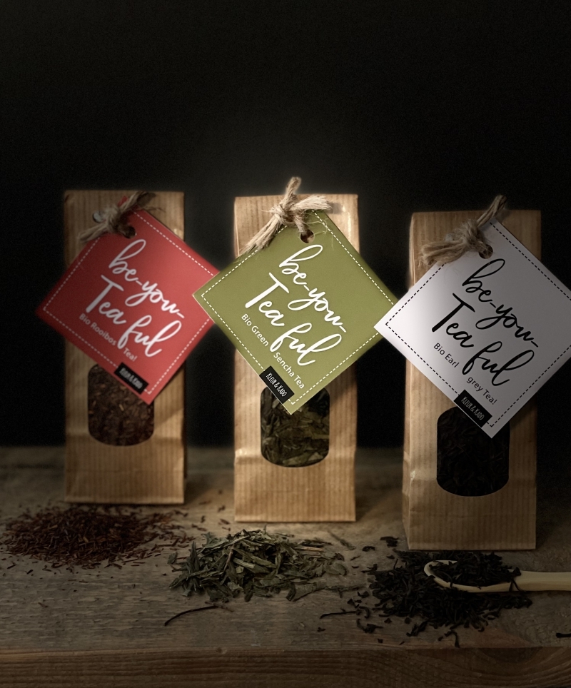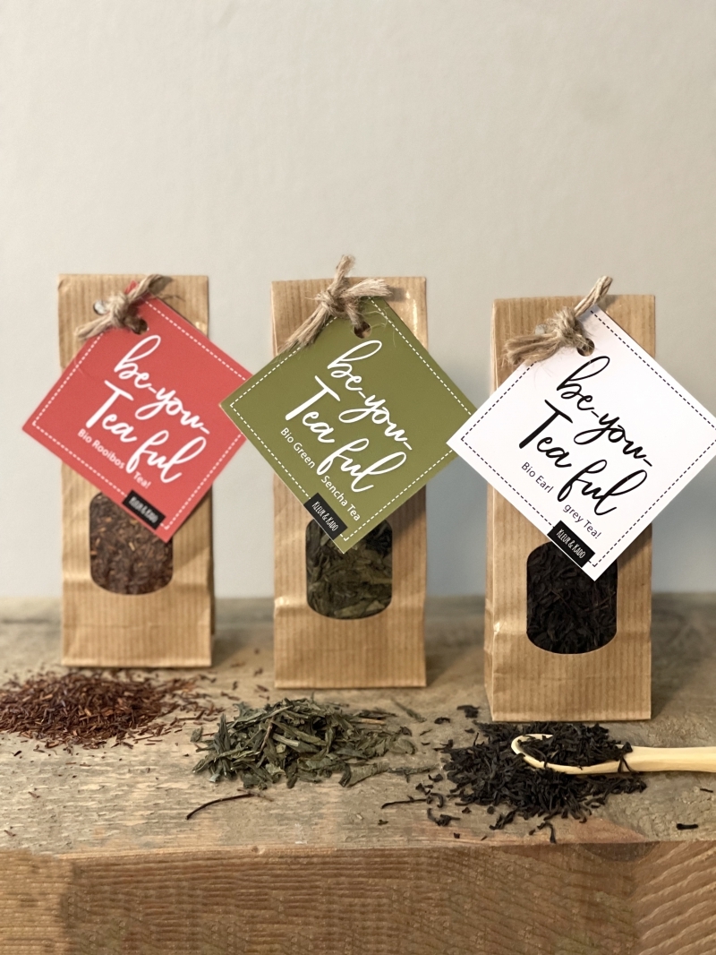 Kraft zakje Be-you-TEA-ful gevuld met biologische losse thee. Inhoud zakje 5,5x15x3cm ca. 25/30g.